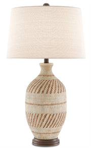 The earthen basket-weave texture of the Faiyum Table Lamp enlivens its classic pottery form. Combined with the tan and brown glazes on the terracotta surface, the woven pattern, hand-rubbed bronze hardware, and flax linen shade bring the tan lamp an ethnic feel.