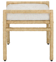 With the earthy feel of rattan and wicker but with a much heavier dose of personality, the Olisa Natural Ottoman is made of wrought iron that is covered in braided Abaca rope. This rattan bench is upholstered in Rowann Pearl fabric, which is made of 40 percent rayon, 33 percent cotton, 25 percent polyester and 1 percent nylon.