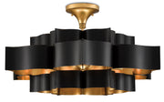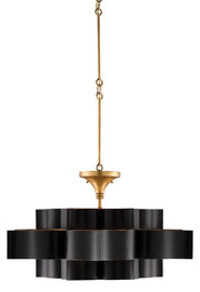 The Grand Lotus Black Large Chandelier receives its majestic good looks from a combination of stunning workmanship and a mix of satin black and contemporary gold leaf finishes. The black chandelier is skillfully fashioned from wrought iron.
