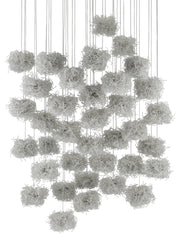 The Birds Nest 36-Light Multi-Drop Pendant is an effervescent beaded pendant that looks like luminous nests. Rather than twigs, the shades are made up of whorls of clear beads strung along pieces of wire. It takes many hours for our artisans to create these shades that look so whimsical. The canopy of this piece is luminous in a painted silver finish. This fixture is among Currey & Company's multi-drop pendant collection, which includes multiple configurations.