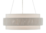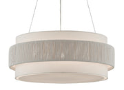 Our Rousham Chandelier, designed by Clarence Mallari, has an unusual accent on its fabric shade created by the twine panel made from recycled paper that is twisted and tightly wrapped around a metal frame. The panel made from the sustainable material, which is affixed to the center of the shade, is then coated with a sealant to protect it from moisture. The beige chandelier is suspended with aircraft cable and has a sugar white finish on the interior of the shade, which brightens the light.