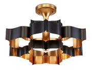 The Grand Lotus Black Small Chandelier receives its good looks from a combination of stunning workmanship and a mix of satin black and contemporary gold leaf finishes. The black chandelier is skillfully fashioned from wrought iron.
