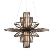 Made of steel in a Cupertino finish, the Benjiro Chandelier was designed by Ian Thornton. The off-white fabric shades fitted into the inner-most cylinders soften the glow of the LED bulbs. Inspired by mid-century modern shapes with a bit of a space-aged twist, Ian tapped into the famed era when wicker and macrame shapes with exploding profiles were all the rage. The dark brown chandelier hangs on aircraft cable to create the illusion it is floating.