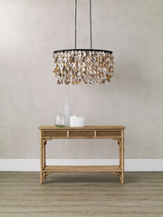 The Stillwater Oval Chandelier dangles strands of hand-selected oyster shells from a wrought iron frame in a blacksmith finish. This versatile shell chandelier illustrates the artistry with which our design team approaches natural, nautical materials.