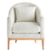 A washed Oak wood base and legs are upholstered with off-white boucle performance-treated fabric over a foam cushion to form the Kendra chair. The soft curves of the arms and backing are met with angular shapes in the seat, creating a modestly elegant silhouette. A loose back pillow provides extra comfort and style to this versatile chair.