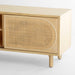 Woven rattan insets and natural oak finishes give the Lamu series a distinct aesthetic reminiscent of a modern exotic retreat. The media console within the series features three sliding doors that reveal an abundance of storage space with adjustable shelving. Its height is modest to accommodate for optimal viewing of large screens. Cutouts on the backside of the unit allow for discreet cable management for electronics. The signature rattan panels allow for remote signals to reach the consoles within without revealing the contents. Functionality, versatility, and style manifest in this attractive piece.