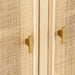 Woven rattan insets and natural oak finishes give the Lamu series a distinct aesthetic reminiscent of a modern exotic retreat. The cabinet within the series features generous storage space provided by six compartments that are created by four fixed shelves divided down the center. Bent oak finished in black provides a gently arched top silhouette. The exposed shelving space sits atop a closed cabinet furnished with one shelf per side. Rattan inset doors with adjustable hinges and brass door pulls seal the lower cabinet space. Sturdy, solid oak legs provide foundational support for this inspired piece.