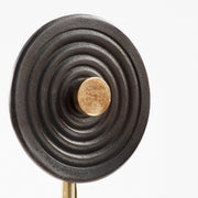 A symbol of protection, the Mati is well known in many cultures around the world as the "evil eye." Two overlapping, concentric circles create the recognizable motif known to ward off evil spirits in the Mati sculpture. This stylized adaptation is crafted from textured cast aluminum bronze finished disks surrounded by an antique brass center. A matching antique brass stem fixes the sculpture to a cylindrical veslana marble base. With three sizes available in this series, the Mata sculpture is best shown in multiples to create a striking display.