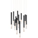 Hexagonal tubes of various lengths support blocks of naturally translucent rock crystal. Each stone varies in diaphaneity making a unique display of refracted light. Available in a plated soft Gold or Matte Black, this luxurious LED pendant light cluster and coordinating wall sconce accentuates the beauty of the natural quartz material.