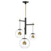 Three sizes of thick Clear glass orbs are suspended displaying a small aluminum sphere encompassed within. Discretely recessed dedicated LED provides ample lighting without glare. Branching out from a central structural column, the striking Black and Satin Brass combination an additional LED light source directs light downward. These atomically inspired fixtures are sure to make a statement.