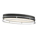 Basic form and rich finishes give prominence to clean elegance. A frosted glass sits securely within a matte black drum that houses LED light. This effortless design draws attention to the simple decorative rings that frame the black cylinder in bright contrast.