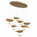 Handmade metal shades feature a hammered surface for an organic dimpled texture. The uniquely curved uplight is reflected into the underside of the dome, creating a soft diffused glow. Inspired by lily pads, this free flowing form provides a magically beautiful aesthetic that is enhanced as each head cascades down.