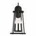 A slightly tapered drum of mouth blown clear glass sits within a rounded caged design. The simple bulb cluster is supported by a single black ring for a modern take on the classic candelabra. This extensive line features a post light, pendant, flushmount, and two wall sconces for you to choose from.