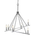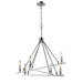 Strong, linear lines intersect, gracefully creating a balanced airy feel. In Garvin's unexpected and playful design, asymmetrical arms are juxtaposed to imply movement. Slender candles enhance the fluid look which seems to defy the sturdy steel construction. This clean, creative design will liven transitional to modern decors. This 6 light chandelier is comfortably sized for a dining room and is a stylish focal point.