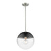 Mid-century modern design with a modern twist, these fashionable orbs are highly customizable. Available in clear or opal glass with plated chrome, pewter or brass or smooth matte black hardware. Caps are available in a number of accent colors to further customize your look. Choose colors and finishes that complement your existing décor or design your entire room around your favorite color combination. This large pendant is comfortably sized for a small nook or island and may be hung individually or arrayed as a set.