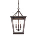The Davenport collection is an updated, traditional style that features a series of large, traditional, classic box lanterns. The open-cage design is accented by a simple, decorative, rope braid detail and the exposed steel candles and candelabra bulbs create a stunning effect. The hand-painted Etruscan Bronze finish is multi-layer and has faint gold highlights. This 3-light pendant is perfect for a small dining room, nook, or entry.