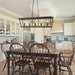 The Davenport collection is an updated, traditional style that features a series of large, traditional, classic box lanterns. The open-cage design is accented by a simple, decorative, rope braid detail and the exposed steel candles and candelabra bulbs create a stunning effect. The hand-painted Etruscan Bronze finish is multi-layer and has faint gold highlights. This 5-light linear pendant illuminates a kitchen bar, dining table, or similar area without interfering with activity at the surface.