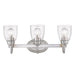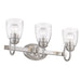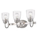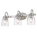 Simple and elegant, the Parrish collection is a lovely blend of masculine and feminine, old and new. A number of versatile finishes are available. The modern finishes overlay graceful, traditional arms for a transitional look. Matching socket covers add a touch of color to the clear, textured seeded glass. The contemporary shape of the glass and simple finish give this otherwise classic silhouette a modern update. Perfect for traditional to transitional interiors, this charming collection is a timeless beauty. This family offers a variety of fixtures to suit all of your interior lighting needs. This 3-light bath vanity is UL-approved for damp locations and will provide well-diffused light over a vanity or mirror.