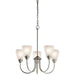 Enjoy the splendor of this Brushed Nickel 5 light LED chandelier from the refreshing Jolie Collection. The clean lines are beautifully accented by satin etched glass. Jolie is the perfect transitional style for a variety of homes.