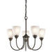 Enjoy the splendor of this Olde Bronze 5 light LED chandelier from the refreshing Jolie Collection. The clean lines are beautifully accented by satin etched glass. Jolie is the perfect transitional style for a variety of homes.