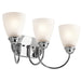 Enjoy the splendor of this Chrome 3 light LED bath light from the refreshing Jolie Collection. The clean lines are beautifully accented by satin etched glass. Jolie is the perfect transitional style for a variety of homes.