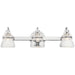 Vintage, industrial and feminine styling all come together with the Talland 3 light bath light. The unique glass is reminiscent of the fixtures found on telegraph and electrical poles through the early and mid-1900s. The Chrome finish adds a pop of shine and style against muted colors and black accent pieces.