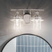 The Everett 16 inch 2 light vanity light adds a dash of industrial glam above your bathroom mirror. Two mini Clear Glass pendants are suspended from curved arms and round backplate in Polished Nickel. Look closely, and you'll see delicate discs hold each pendant â and your attention.
