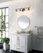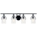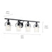 BlackThe Everett 24 inch 4 light vanity light adds a dash of industrial glam above your bathroom mirror. Four mini Clear Glass pendants are suspended from curved arms and a round backplate in Polished Nickel. Look closely, and you'll see delicate discs hold each pendant â and your attention.