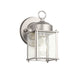The one light New Street Wall Lantern features a classic profile with Sterling Silver finish and clear glass panels. It uses a 60-watt (max.) bulb, measures 8" high, and is U.L. listed for wet location.