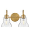 Vera's unique, shapely form takes the traditional bell-shaped shades to a new level. Plenty of light shines up or down from the clear glass, making it a functional choice for main baths and powder rooms alike. Finished in Black or Lacquered Brass, Vera's chic profile brings transitional style to any space.