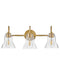 Vera's unique, shapely form takes the traditional bell-shaped shades to a new level. Plenty of light shines up or down from the clear glass, making it a functional choice for main baths and powder rooms alike. Finished in Black or Lacquered Brass, Vera's chic profile brings transitional style to any space.