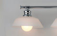 Satin White cased glass shades in an RLM shape are mounted to a nostalgic Polished Chrome frame to create this clean and classic look. The larger scale glass sets this look apart and makes a statement over the vanity.