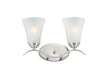Gently waving arms of Satin Nickel or Oil Rubbed Bronze support tall-profile Frosted glass shades creating a scale normally not found in this category of lighting. The bath vanity may be installed up or down and also includes a Polished Chrome finish.