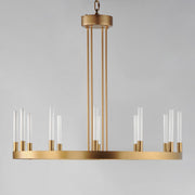 A modern tribute to the wheel chandelier, the Ovation collection integrates LED technology for a dazzling lighting effect. The LED light produces a shimmering lighting effect along the tall and narrow fluted glass shades adding celebratory effervescence. The expansive diameters of the rings join at the center in equipoise using four down rods to suspend the frame. Mount the chandelier from the collector or make use of additional chain supplied to extend the height with ease. Additional sconces with up and down lighting complete the design. Available in Brushed Brass or Black, the collection toasts a classic design creating an elegant statement.