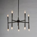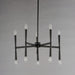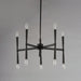 Civic styling using straight rectilinear channels radiating from a central connector. The light sources flare out both up and down with tapered candle covers creating a form evocative of a classic torch. Available in matte Black, Satin Brass, and Satin Nickel, this is a transitional look suited to a variety of architectural stylings.