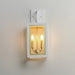 Two-tone frames of Black or White with internal Gold frames provides a neoclassical approach to the squared coach lantern. The sconces jut out from the wall on well-defined trusses that add a contemporary element. Delivering a classic design that suits most exteriors, this collection adds interest in the interior contrasting frame of Gold that secures clear glass panes to diffuse the lamp within.