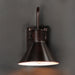 The conical metal shades on these outdoor sconces draw inspiration fromÃÂ the heartland using embellishmentsÃÂ such as riveted accentsÃÂ and fastened rings to add rustic charm. The products areÃÂ finished in a richÃÂ Bronze outdoor rated powder coat, andÃÂ complements similarly styled exterior elements such as honedÃÂ stone facades and woodÃÂ siding.