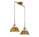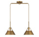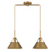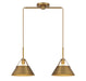 Keep your sense of style in balance with this highly chic Meridian 2-light chandelier. Two sleek lengths of cord are topped with metal shades that direct the light downward while also allowing a little peek at the light bulb above the shade. Natural brass finish. 15.5" height, 29" length, 10.5" width. Max height 136". Max 60 watts per bulb, standard size A19 bulbs recommended. LED bulb compatible. Supplied with 120" of cord.