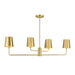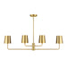 Heighten the drama in your home with this chic 4-light linear chandelier. The whole fixture, including the metal shades, is finished in Natural Brass for a glow that is boldly concentrated like a spotlight. Plus, you can adjust the two tiers of arms to really customize the look. This linear chandelier is 42" in length, 17.25" in width and has an adjustable height ranging from 10" to 64". It comes with four 12" downrods and one 6" downrod. Uses 4 standard size bulbs of up to 60 watts per bulb. Bulbs not included.