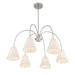 Style cascades down with the slender and curving arms of this 6-light chandelier, which are finished in Brushed Nickel and decorated with white linen fabric shades. It has an adjustable height ranging from 16" to 70" and is 30" in width. It uses 6 candelabra size bulbs of up to 60 watts per bulb. Bulbs not included. Comes with four 12" downrods and one 6" downrod.