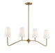 Brighten up a kitchen island or a long dining room table with this Meridian 4-light linear chandelier. It showcases an elegant look that draws inspiration from the days of midcentury modern style, pairing conical shades of white fabric with a natural brass finish. It is 13" in height, 40" in length and 5" in width, plus it includes four 12" downrods and one 6" downrod to let you adjust the height for a maximum of 67". This chandelier uses 4 candelabra size bulbs with a max of 60 watts per bulb, is LED compatible, is dimmable and can be used on a sloped ceiling.