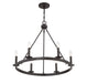 Featuring a stylish wagon-wheel shape, this Meridian 6-light chandelier offers up chic and versatile lighting for a wide variety of spaces and decor styles. Use it to brighten up a dining table, a living room, a bedroomâ¦the possibilities are endless! Finished in oil rubbed bronze. This chandelier is 22" in height and 26" in width, plus it includes 120" of chain to let you adjust the height. This chandelier uses 6 candelabra size bulbs of up to 60 watts each, is LED compatible and is dimmable.