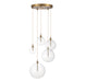 This Meridian 5-light pendant showcases clean, minimal styling with hand-blown orbs of clear glass and a natural brass finish. You can adjust the hanging height of each light for total customization! Bi-pin T4 LED bulbs included.