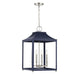 Crisp and traditional lantern style lighting is given an update in this Meridian 4-light pendant, which features a navy blue finish accentuated by polished nickel. 25.5" height and 15.25" width. Max 60 watts per bulb, candelabra size C11 bulbs recommended. LED bulb compatible. Supplied with 120" of chain.