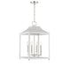 Crisp and traditional lantern style lighting is given an update in this Meridian 4-light pendant, which features a white finish accentuated by polished nickel. 25.5" height and 15.25" width. Max 60 watts per bulb, candelabra size C11 bulbs recommended. LED bulb compatible. Supplied with 120" of chain.