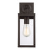 This bold 1-light outdoor wall light will bring a thoughtful touch of modern farmhouse flair to your great outdoors! An angular structure holds panes of clear glass and is finished in oil rubbed bronze. Wet area rated. It is 10" in height and 5" in width. It extends 5.5" from the wall. It uses 1 standard size bulb of up to 60 watts, is LED compatible and is dimmable.