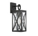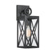Illuminate your great outdoors with the geometric style of this chic 1-light outdoor wall light. It has a sleek rectangular shape with crisscross detailing and hangs on the backplate by way of a circular hoop. Finished in black. Wet area rated. It is 13.75" in height and 5" in width. It extends 6.25" from the wall. It uses 1 standard size bulb of up to 60 watts, is LED compatible and is dimmable.