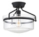 This 1-light semi-flush ceiling light is a smart way to add illumination and bold style to any space. It showcases a clear glass shade with a shape that hints at vintage style inspiration, paired with band detailing and angled arms in matte black finish. It is 11" in height and 13.25" in width. This light uses 1 standard size bulb with a maximum of 60 watts, is LED compatible and is dimmable.