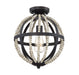 A geometric structure and natural wood beads meet in this flush mount light. Oil rubbed bronze finish. 14.5" in height and 12" in width.