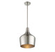 The contemporary style of this 1-light pendant is an excellent choice for fashionable illumination. It has a solid metal shade and is finished in Brushed Nickel. 14" in height and 10.5" in width.